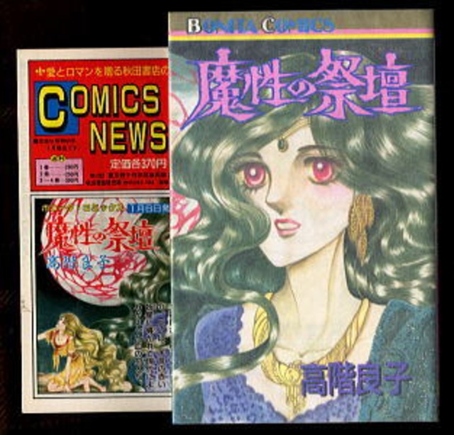 「魔性の祭壇」 *チラシ付 高階良子 秋田書店・ボニータコミックス(新書判) 昭和63年発行の初版、チラシ付 *チラシ=コミックスニュース'88年1月新刊[表紙は「魔性の祭壇」です] *前談の「燃える妖星」も併録 *「良子の「コーヒーブレイク」」(3ページ)有 並上;カバーの角・フチ部極少しわ、裏表紙右下角部から本文の後半の十数枚の下角部極少折れ、後ろソデの下フチ部少しわ (関連ワード: ましょうのさだん たかしなりょうこ ボニータコミックス 燃える妖星 コーヒーブレイク )