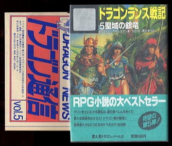 「ドラゴンランス戦記(5) 聖域の銀竜」 *帯付・チラシ付 マーガレット・ワイス&トレイシー・ヒックマン 安田均・鷹井澄子/訳 富士見書房・富士見ドラゴンノベルズ15(文庫判) 昭和63年発行の初版、帯付、チラシ「ドラゴン通信vol.5 新連載!ゲームぶっくらんど」付 *アドバンスト・ダンジョン&ドラゴンズ(AD&D)の設定を使ったノベライズです *全400頁 *訳者によるあとがき有 並;紙カバーのため角・フチ部極少すれ、背下シワ大、カバー下フチ部しわ、地部極少汚れ、裏表紙左上角部少しわ、カバーの裏側の背表紙下部に汚れ有、P125-135の上角極々少折れ、帯のフチ部極少すれ (関連ワード: どらごんらんすせんき 5巻 せいいきのぎんりゅう まーがれっと・わいす とれいしー・ひっくまん ワイス&ヒックマン やすだひとし どらごんつうしん ファンタジー 剣と魔法 )