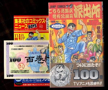 「こちら葛飾区亀有公園前派出所(100)」 *初版 *帯付・チラシ付 *こち亀銀行券付 秋本治 村上龍/あとがき 集英社・ジャンプコミックスJC(新書判) 1996年発行の初版、帯付・チラシ「集英社のコミックス・ニュースBOYS Vol.182」付、百巻の「こち亀銀行券」付 *4色カラー口絵付 *カバーの裏側に100巻記念の4色カラー漫画が掲載 *巻末に「オール100巻サブタイトル完全リスト」有 *チラシ=「集英社のコミックス・ニュースBOYS Vol.182」(表紙&裏表紙は「こちら葛飾区亀有公園前派出所」) 並;背上シワ、カバーの角部極少しわ、帯の裏表紙右フチ極少すれ、帯の裏表紙側左下フチ部若干しわ、チラシに若干凹みキズ有 (関連ワード: こちらかつしかうかめありこうえんまえはしゅつじょ 100巻 こちかめぎんこうけん あきもとおさむ むらかみりゅう じゃんぷこみっくす 週刊少年ジャンプ 警察 警官 両津勘吉 両さん コミックスニュース こみっくす・にゅーすぼーいず )