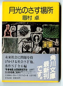 「月光のさす場所」 *初版 *帯付 眉村卓 鏡明/解説5頁 木村光佑/カバー 角川書店・角川文庫(緑357-43) 昭和60年発行の初版、しおり付・チラシ2種「'85角川文庫ヴィンテージフェア」角川10年 「二代目はクリスチャン/早春物語」(写真有)付 *秀作SF全6篇収録 *収録=「鳳凰傘下」「月光のさす場所」「暁の前」「オーディション」「霧に還る」「剥落の冬」 *チラシは2枚とも折れ有 *しおり(角部少折れ有)=「リーベンデール」(雪印のアイスクリームの広告)/映画優待割引券「二代目はクリスチャン・早春物語」 並上;カバ背若干ヤケ、カバー背表紙中央極々少すれ、カバ背上下ふちややすれ、カバ右下ふちわずかに折れ、帯の背上ふちと背の中央に極々少すれ