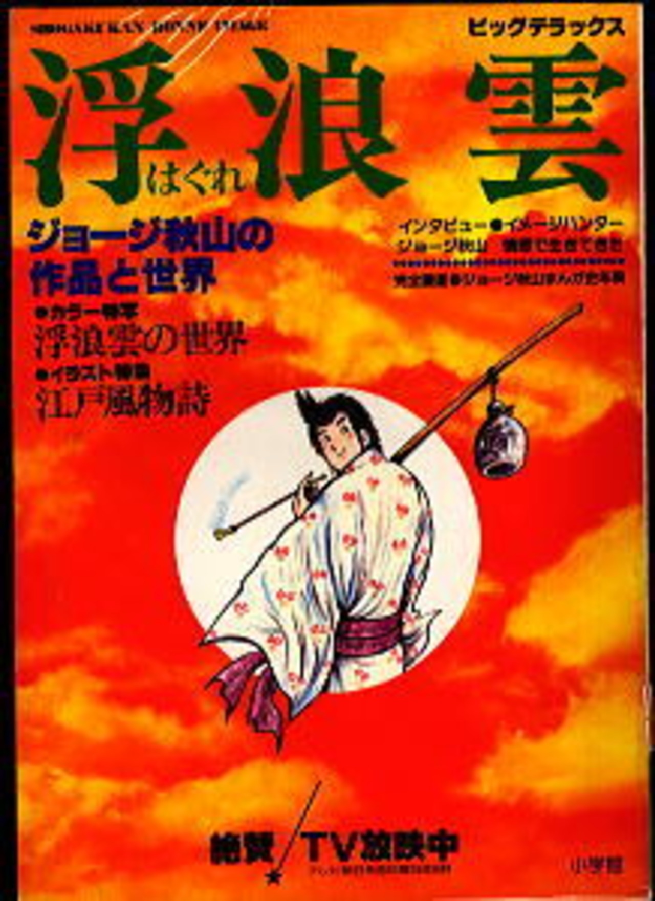 「浮浪雲 ジョージ秋山の作品と世界 小学館ボニーイメージ」 *マンガ版とTVドラマ版(昭和53年放映)のムック本 ジョージ秋山/原作・インタビュー有 小学館・ビッグデラックス(296×208mm) 昭和53年発行の初版、ピンナップ付(TVドラマ版・4色カラー/ジョージ秋山イラスト・モノクロ) *全72頁(内4色カラー40頁、2色カラー16頁) *4色カラーピンナップ付(TVドラマ版の渡哲也、桃井かおり、伊藤洋一の写真を起用) *4色カラーページは基本TVドラマ版のパートで、渡哲也、桃井かおり、伊藤洋一、柴俊夫、佐藤蛾次郎、山崎努、谷啓、笠智衆、等の劇中の写真を掲載 *2色カラーページ=ジョージ秋山イラスト集とロングインタビュー *単色ページ=浮浪雲全キャラクター、ジョージ秋山完全調査まんが史年表、浮浪雲江戸雑学辞典、TVドラマ版の脚本・倉本聰コメント、TVドラマ「浮浪雲」放映リスト、ジョージ秋山コメント *「浮浪雲」のマンガ版と、昭53年放映のTVドラマ版(渡哲也版)のムック本です 並;元々コーティングのない本のため、角・フチ部極少すれ・角部極少しわ、背下少痛み、表紙右下左下角部少しわ