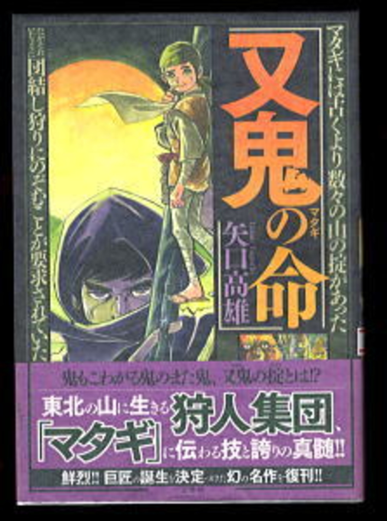 「又鬼の命(マタギのいのち)」 *帯付 矢口高雄 三冬社(A5判) 2008年発行の初版、帯付 *収録作品=「又鬼の命」(「週刊少年マガジン」昭47)、「サスガの三次」(「週刊少年マガジン」昭47)、「父のシロビト」(「週刊少年マガジン」昭48)「わたしのBOO」(「週刊少女フレンド」昭47)「ゴンベのリボン」(「週刊少女フレンド」昭48)(後ろ2作は矢口には珍しい少女マンガです) 並上;背上角部少しわ、帯の裏表紙側右フチ部極少すれ、帯の背下角部極少すれ