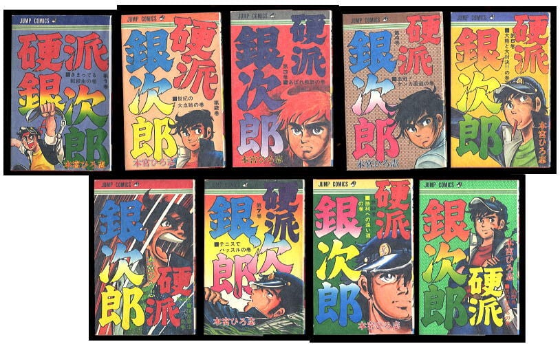 「硬派銀次郎 全9巻揃い」 本宮ひろ志 集英社・ジャンプコミックス(新書判) 1976年発行の初版 *オール初版ですと1~8巻が紙カバーとなるため、初版の揃いは余り出ません *お色気シーン有 *女キャラはもりたじゅんが作画 *あとがき=ちばあきお、田村亮、キャンディーズ、山口いづみ、エバ、渡真介、キャンディーズ・ジュニア、石川さゆり、本宮ひろ志 ★【ゆうパック】で発送いたします 並;(1)-(8)は紙カバーのため角・フチ部少イタミ・少すれ、(1)背上角部イタミ(極少欠)、(2)本文の中央辺りの上角部少折れ、(3)背下角部少キレ、(4)背上下しわ、(6)背上角部少キレ・背下角部すれ・裏表紙下フチ部少しわ、(7)裏表紙右上フチ部すれ・前余白ページシミ汚れ・腹部少シミ汚れ、(9)背上少しわ・背下角部少しわ・P37とP39の下角部極少折れ (関連ワード: こうはぎんじろう もとみやひろし 初版 )
